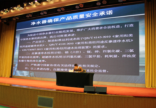 12月12日,合肥榮事達(dá)、浙江沁園、北京碧水源以及上海浩澤等18家凈水器生產(chǎn)企業(yè)代表齊聚國家質(zhì)檢總局,共同向社會做出質(zhì)量安全承諾,公開承諾:嚴(yán)格遵守國家各項有關(guān)法律法規(guī)和相關(guān)規(guī)定,接受社會監(jiān)督,產(chǎn)品設(shè)計、制造標(biāo)準(zhǔn)達(dá)到或者高于有關(guān)國家和行業(yè)標(biāo)準(zhǔn)要求,并明示對鉛、砷、四氯化碳、三氯甲烷等有害物質(zhì)的凈化效率。本次活動是質(zhì)檢總局推動企業(yè)標(biāo)準(zhǔn)自我聲明的一次重要活動。