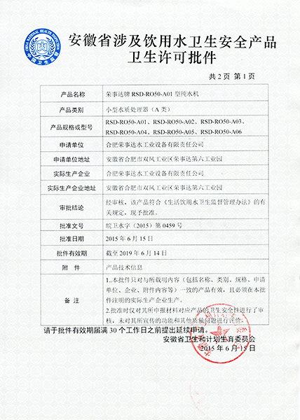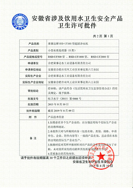 RSD-UF500超濾凈水機(jī)衛(wèi)生許可...