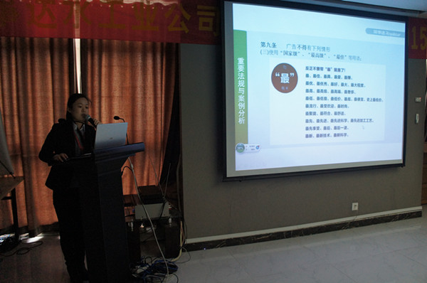 - 新修訂的《中華人民共和國廣告法》于9月1日起正式施行,為更好地貫徹、落實新廣告法,保證公司市場宣傳語營銷活動的有序進行,11月10日下午,榮事達水工業公司新廣告法學習會議在智能研發中心三樓會議室召開,公司各事業部、成員單位總經理及企宣、銷售等相關人員濟濟一堂,共同學習了新廣告法的相關規定。會上,公司企劃總監劉海燕將廣告法條例與公司企宣工作案例相結合,用精心準備的PPT具體詳細地講解了新法實施后企業宣傳中需要整改和注意的要點。從極限詞的禁用到產品代言新規定;從產品外包裝規范到市場活動宣傳注意事項;從企業印刷物料整改到線上線下統一規范,劉總在會上明確要求各部門在實際工作中必須堅決貫徹“從嚴”的原則,認識上從嚴,執行上從嚴,監督上從嚴。為嚴格遵守新法,公司要求各相關部門按照四“全”要求,全面整改不當宣傳內容;全部禁用不合法物料;全線管理企宣形象及廣告;全員監督各種宣傳形式,貫徹公司宣傳規范,以優良的宣傳風格助力市場拓展,向消費者展示積極、健康的企業形象。