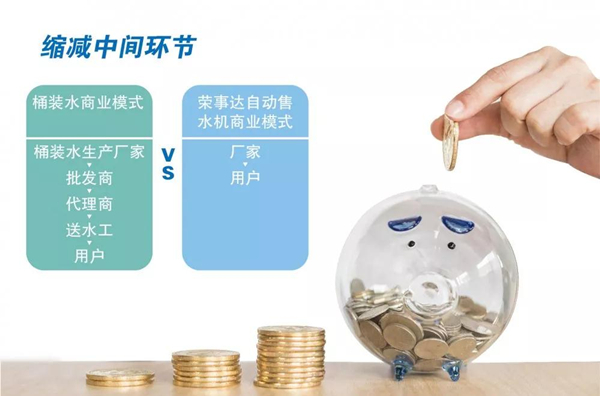 桶裝水的價(jià)格包含廠家生產(chǎn)成本、批發(fā)商差價(jià)、代理商差價(jià)、運(yùn)輸成本、送水工人力成本等諸多費(fèi)用,中間環(huán)節(jié)太多,最終還是有消費(fèi)者買單,而自動售水機(jī)則是廠家直面用戶,大大縮減中間環(huán)節(jié),讓利于客戶,一桶水的價(jià)格相比市面上的品牌桶裝水價(jià)格要少50%以上,大大節(jié)省企業(yè)開支。