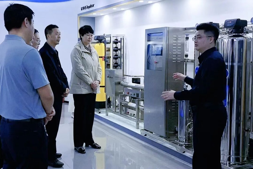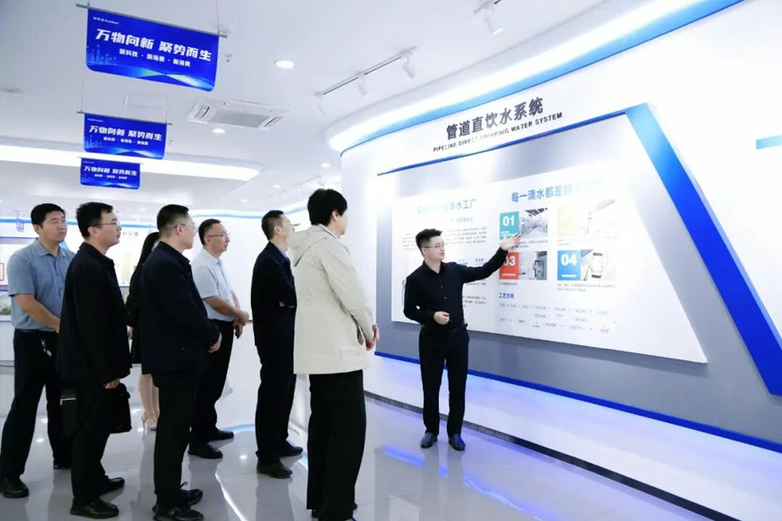 領(lǐng)導(dǎo)一行參觀公司全屋智慧凈水、管道直飲水、校園智慧飲水、單位/工廠直飲水等項(xiàng)目,了解公司在凈水行業(yè)全領(lǐng)域的發(fā)展情況。